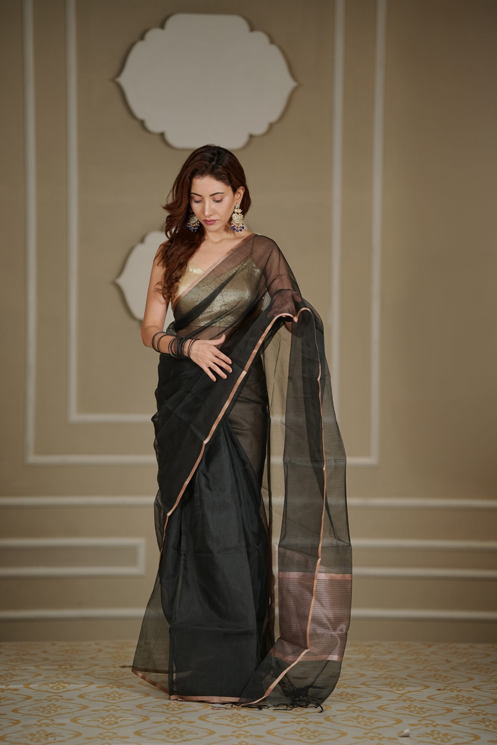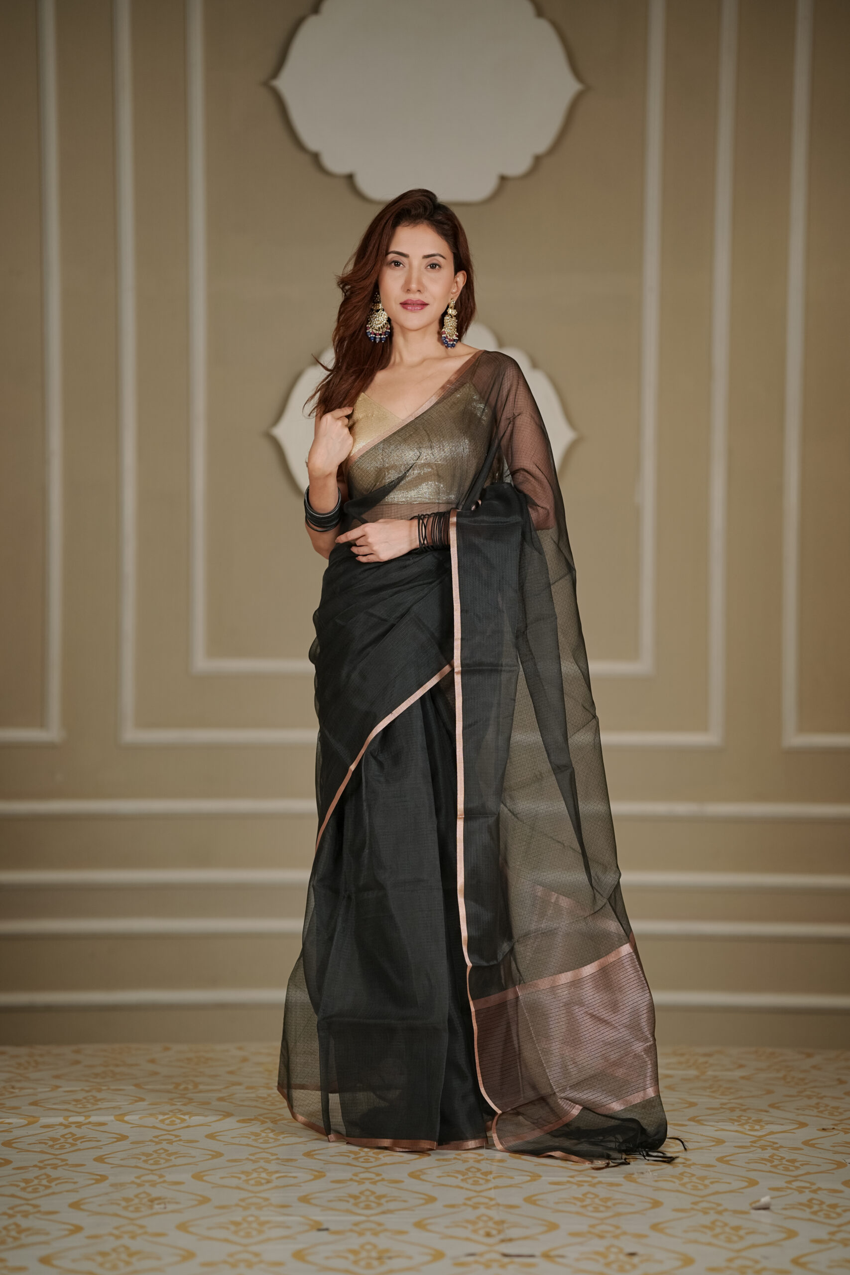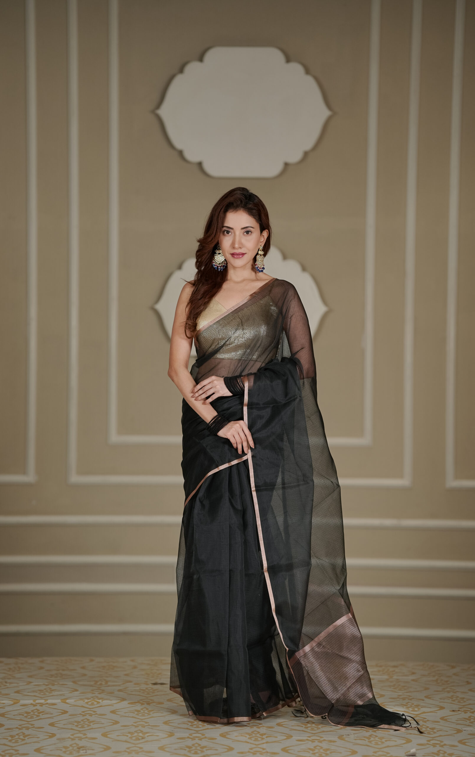 Maroon with Copper Border – Rich and regal, ideal for festive evenings