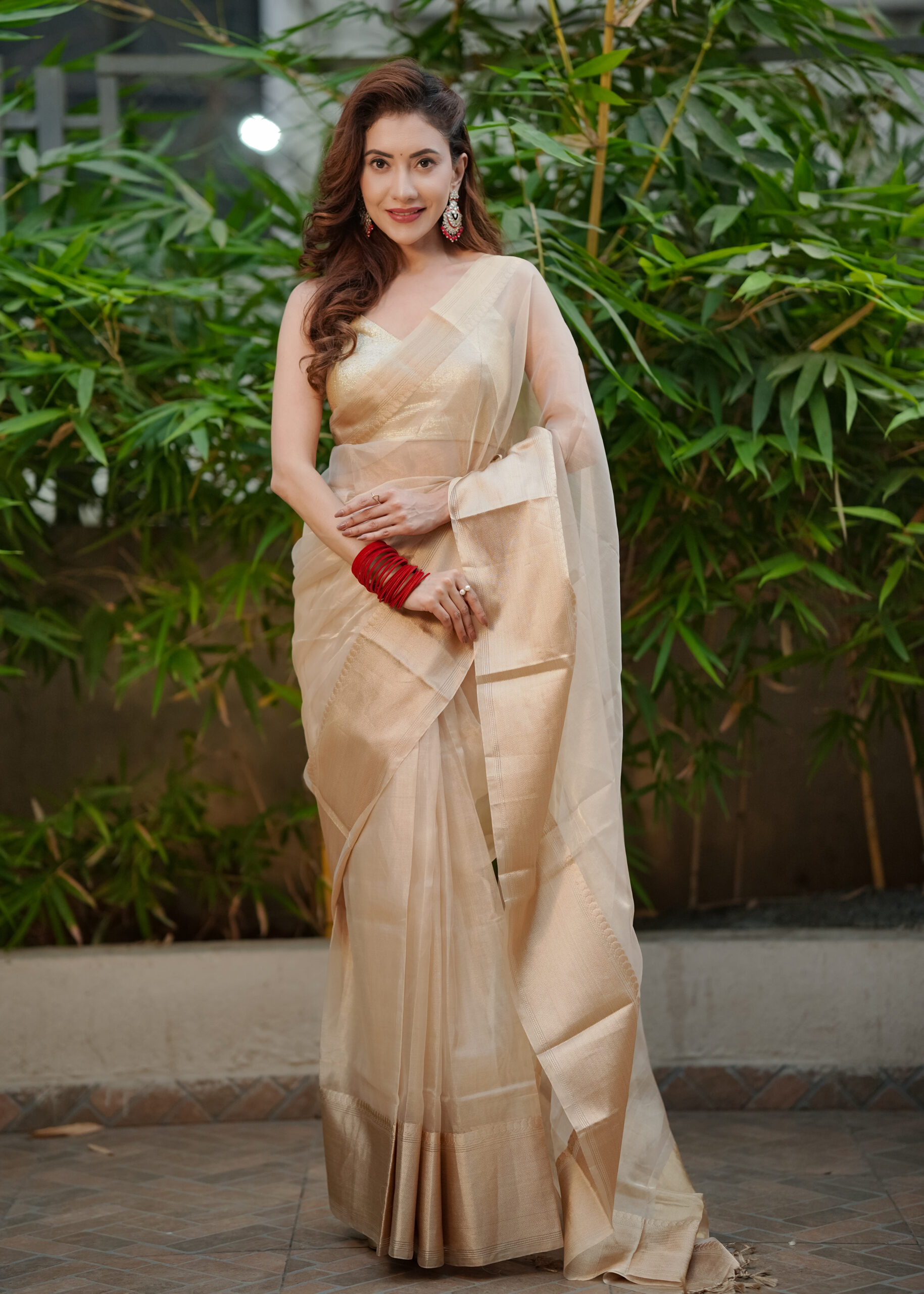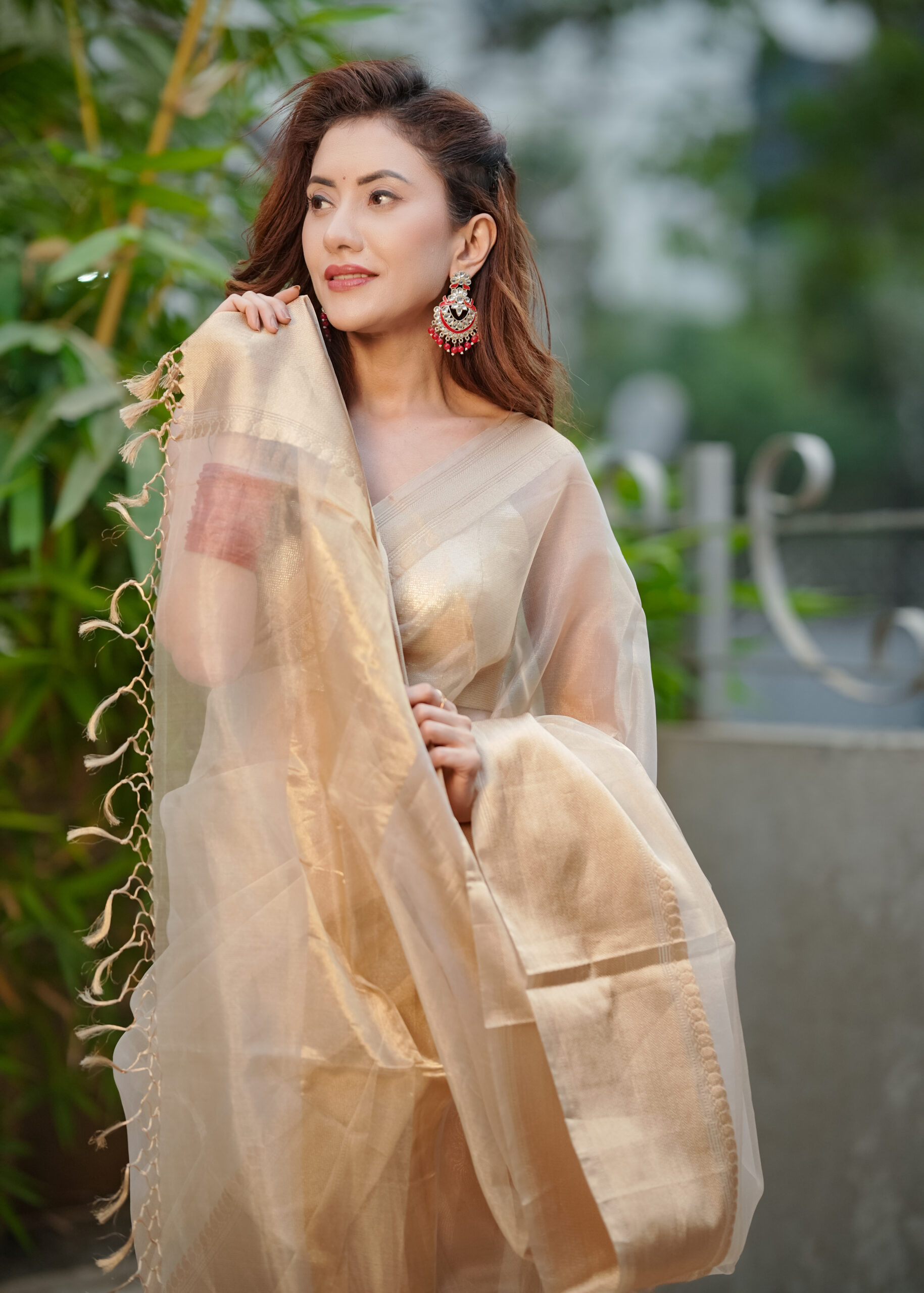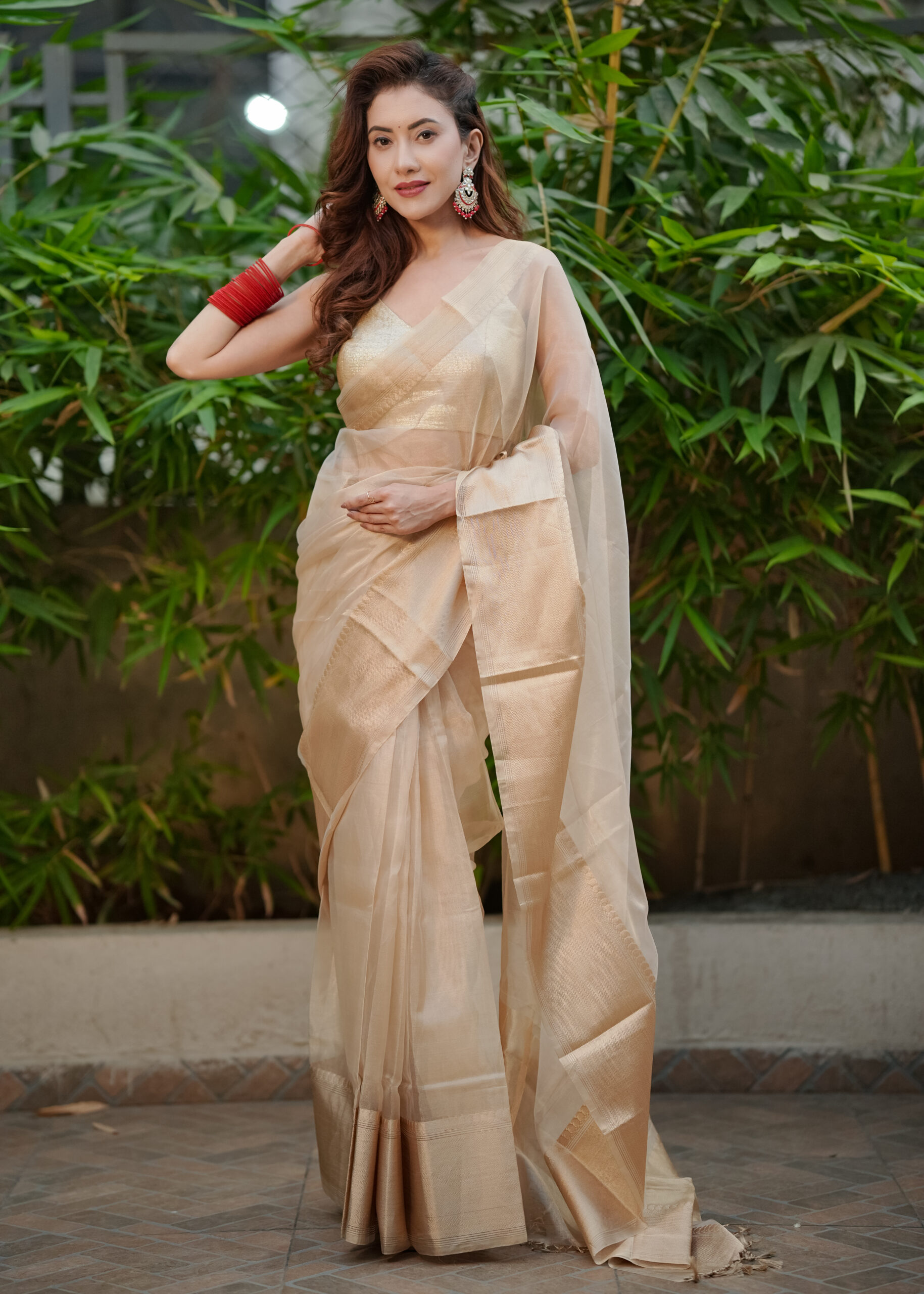 1 Pure Organza Saree in Golden + 1 Matching Unstitched Blouse Piece